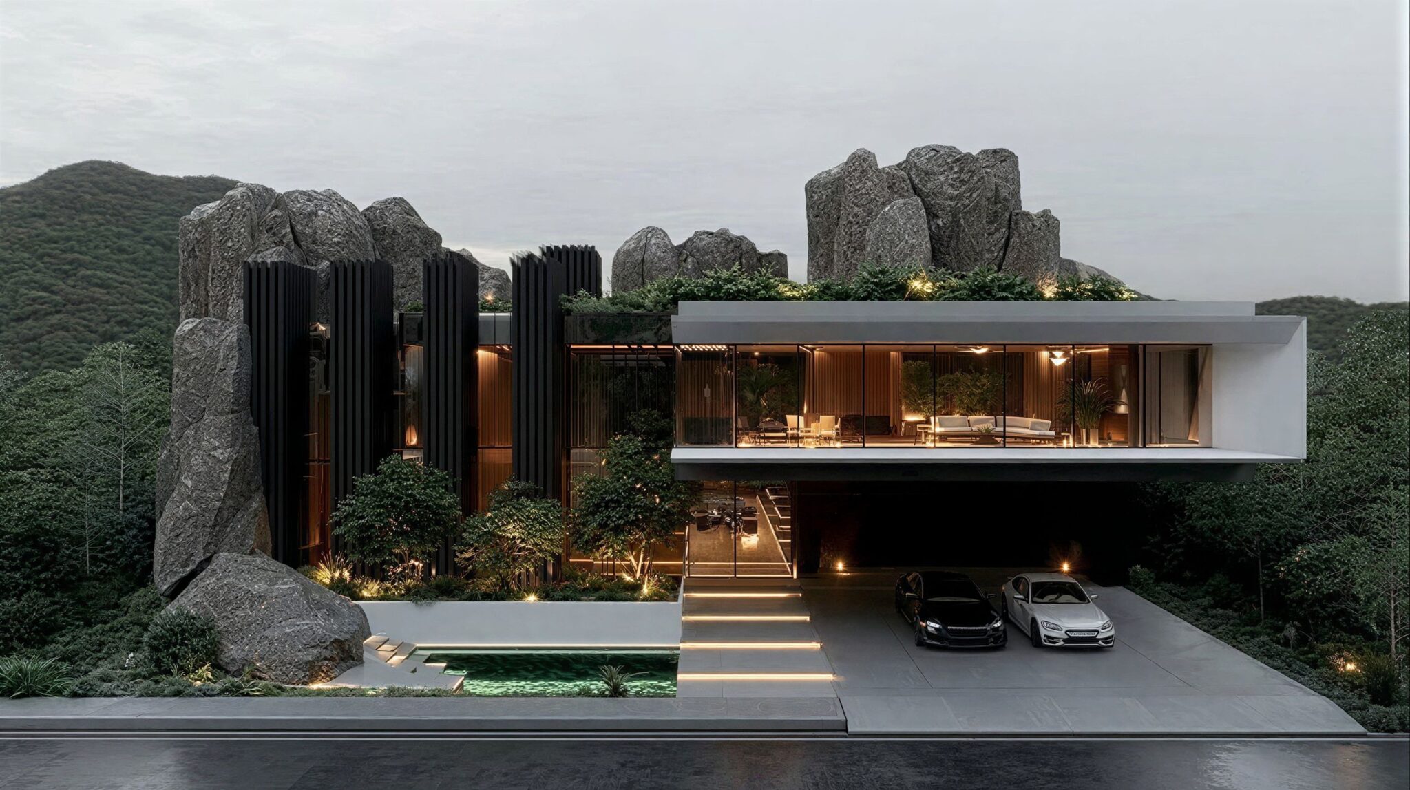 Designed with Biophilic principles, this structure uses raw concrete thermal mass to anchor into the landscape, blurring the lines between the built environment and the natural geology.